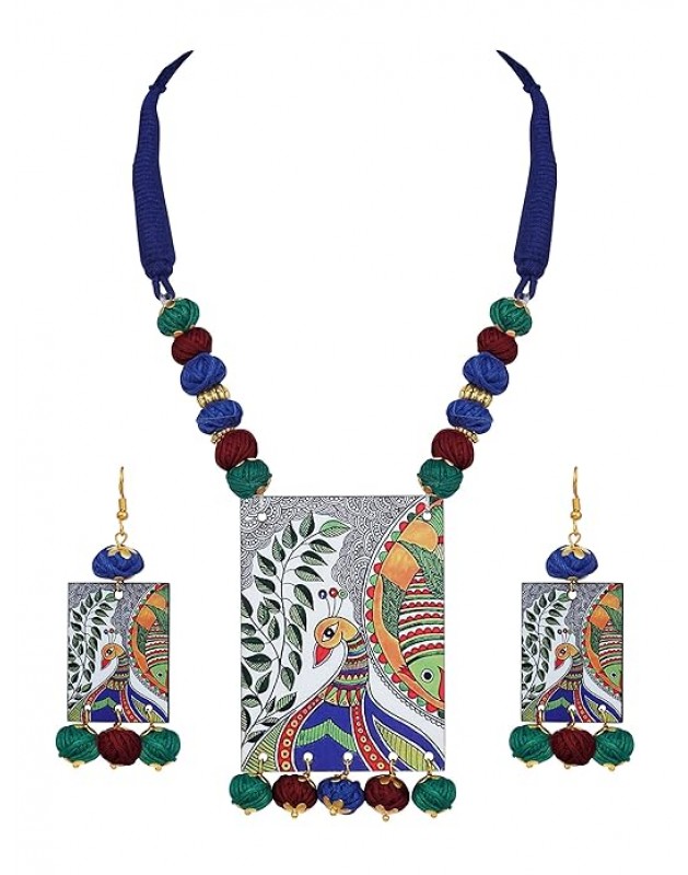 Jewellery for Less Beautiful Warli Painting Faces Pendant with Multi Color and Cotton Bead Adjustable Thread Handcraft Necklace and Dangler Earrings for Women and Girls.